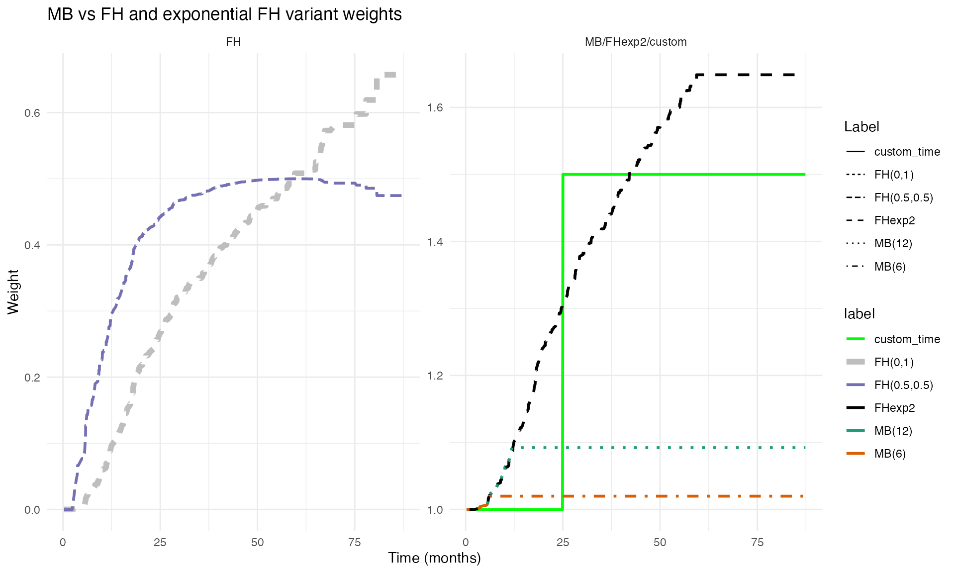- FH(, 0) with (early emphasis): Estimates a hazard ratio reflecting early treatment effects. Under early-separation, this captures the initial treatment benefit.