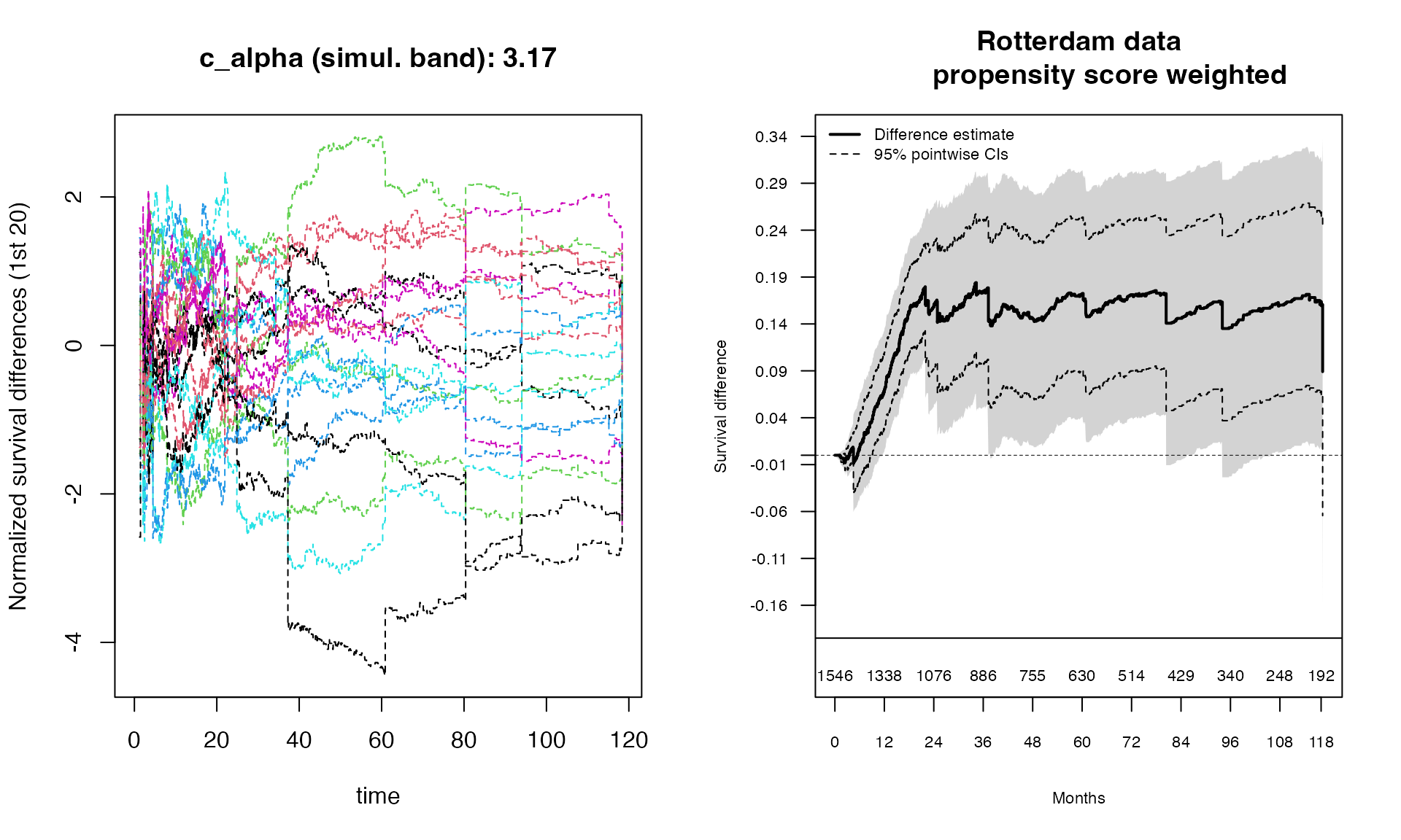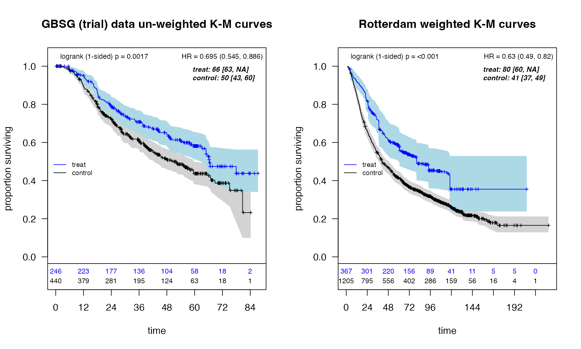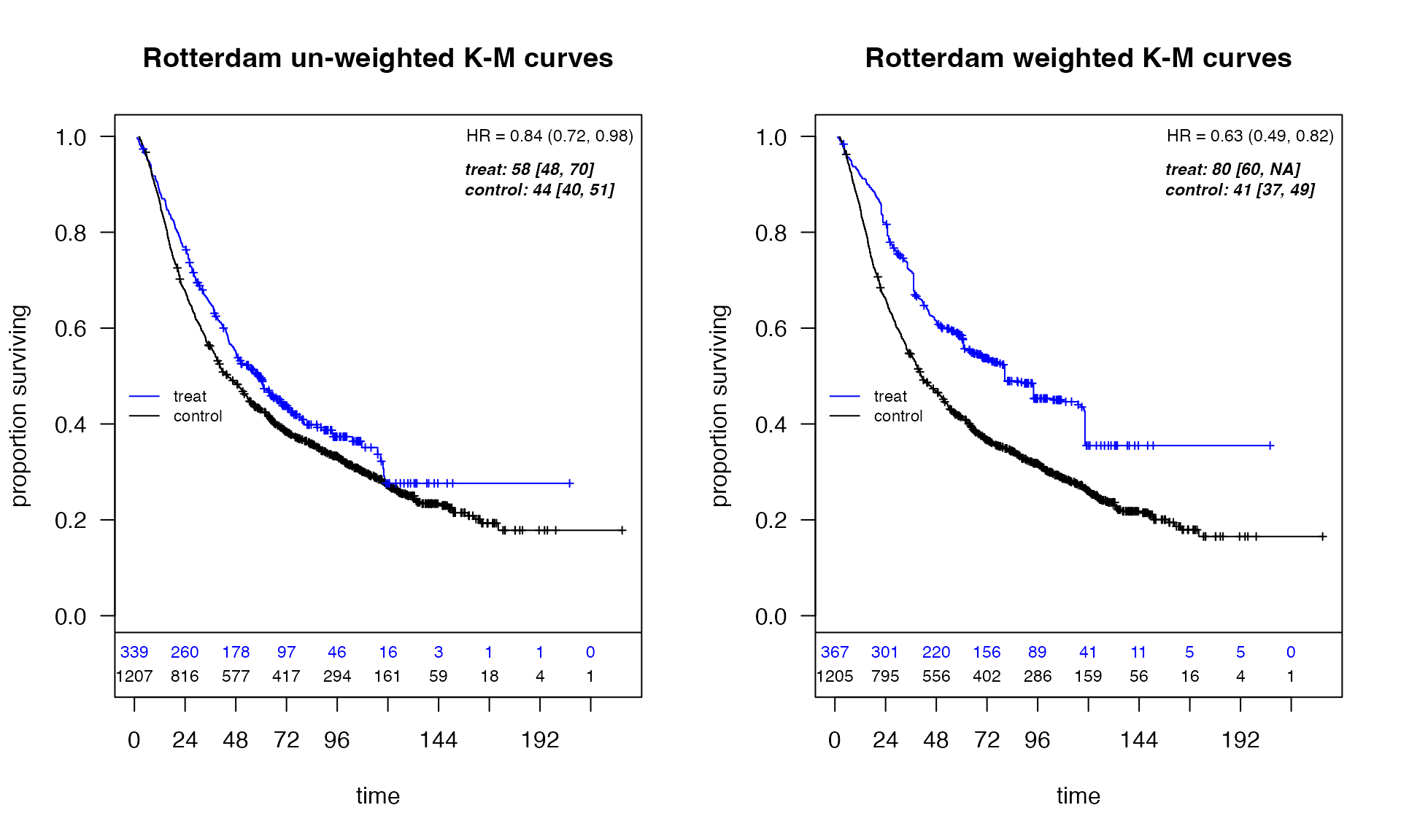iptw <- adjustedsurv(data=df_rotterdam, variable="hormon2", ev_time="time_months", event = "status", method = "iptw_km", treatment_model = ps_model, conf_int = TRUE)Compare KM plots with adjustedCurves package