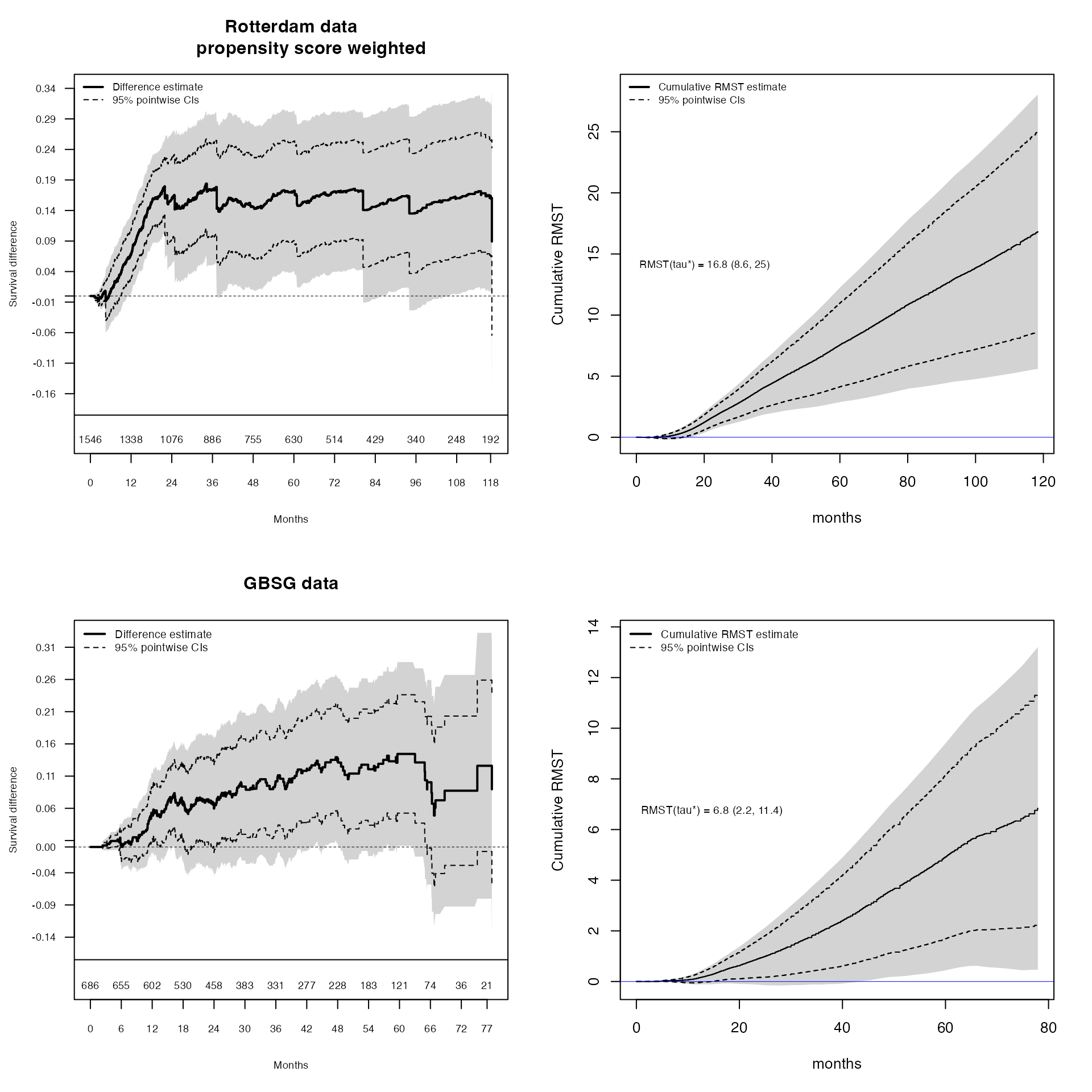 - The code includes functions for calculating cumulative RMST and confidence bands using resampling, with support for weights (rmst_calculations.R).