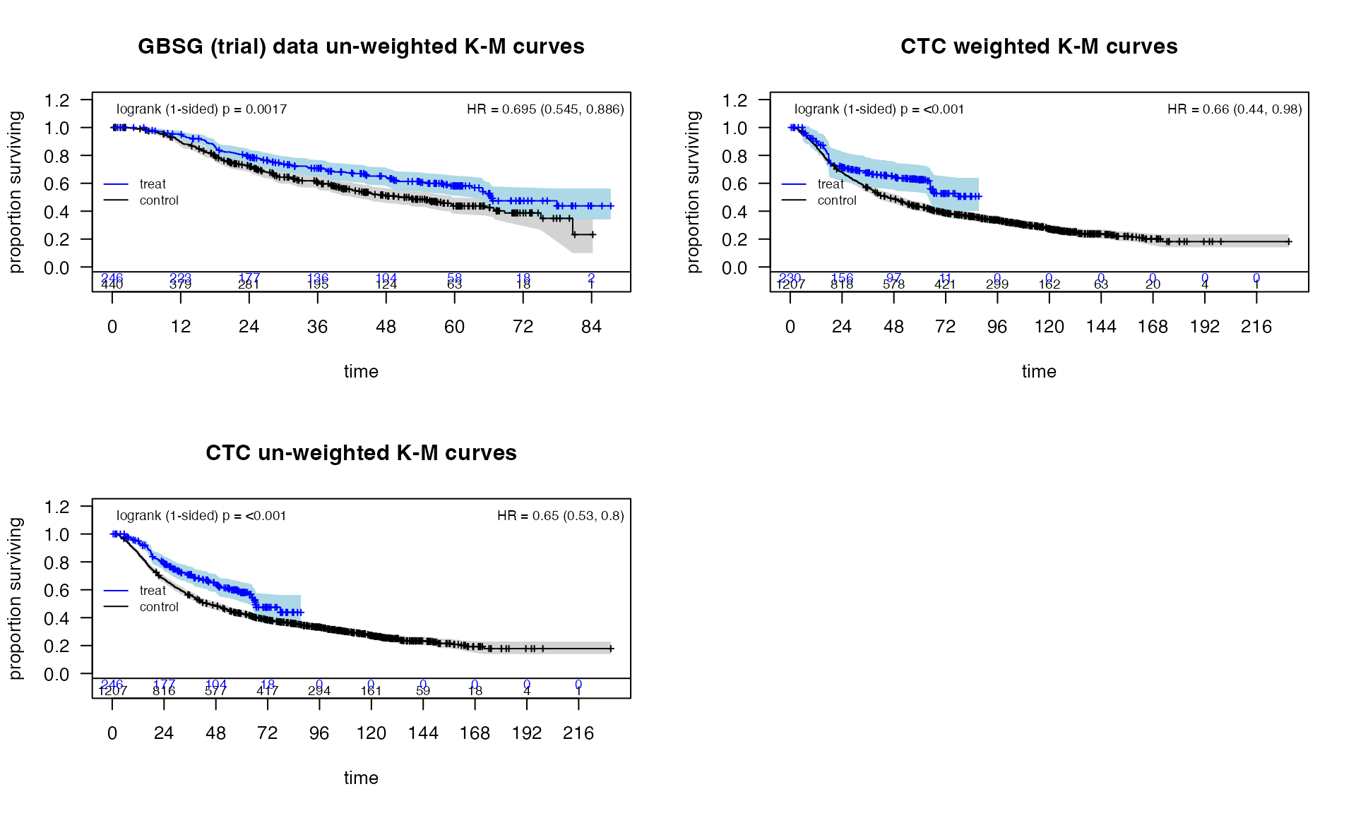 - Weighted survival curves, confidence intervals, and risk tables can be plotted using functions in kmplotting_helpers.R. The plotting functions support the display of weighted KM curves, weighted risk tables, and annotation of statistical results.