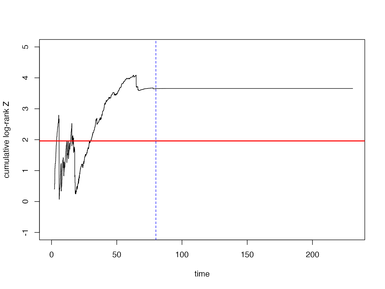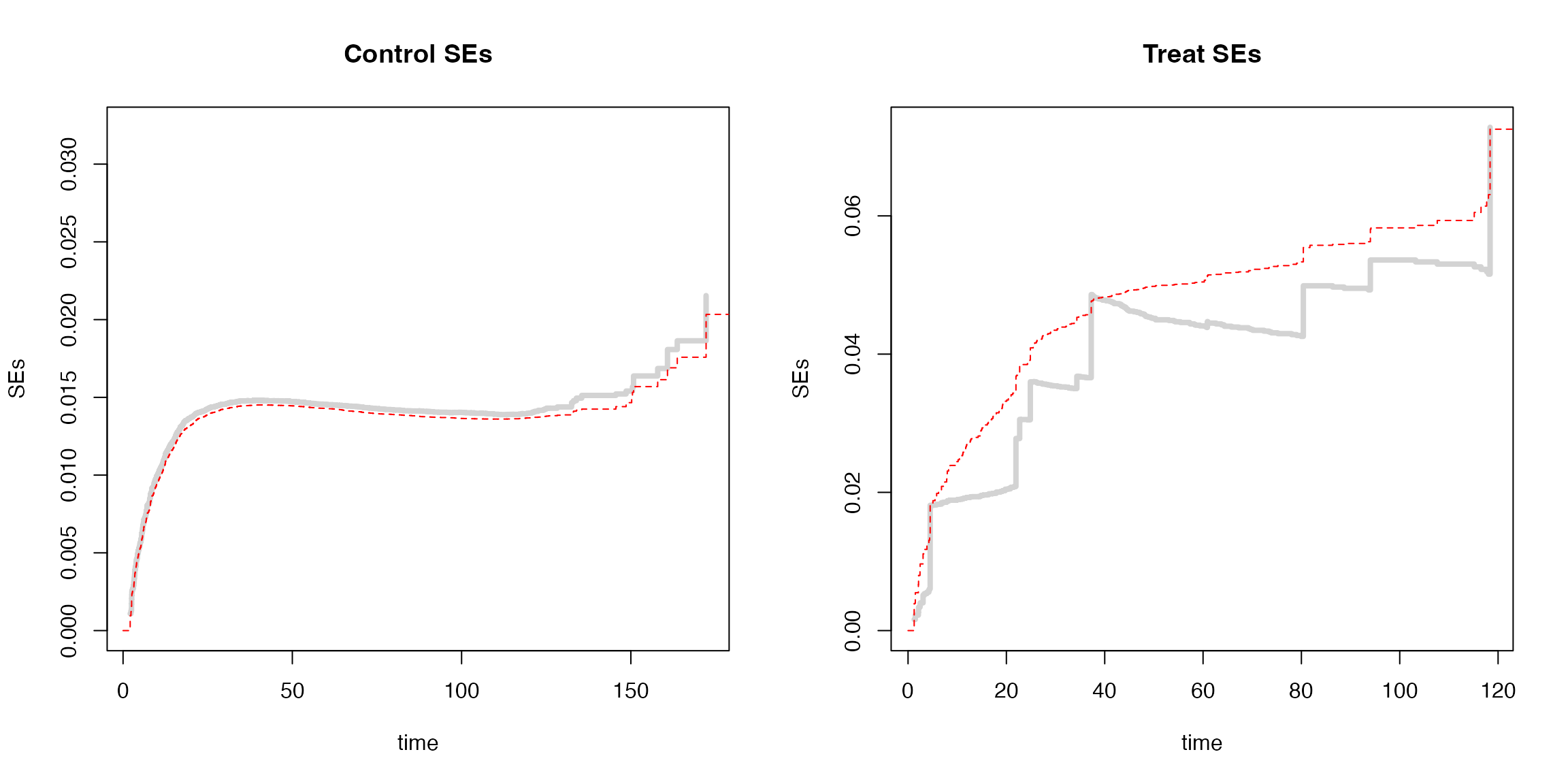 with(df_check, lines(time, se, type="s", lty=2, lwd=1, col="red"))