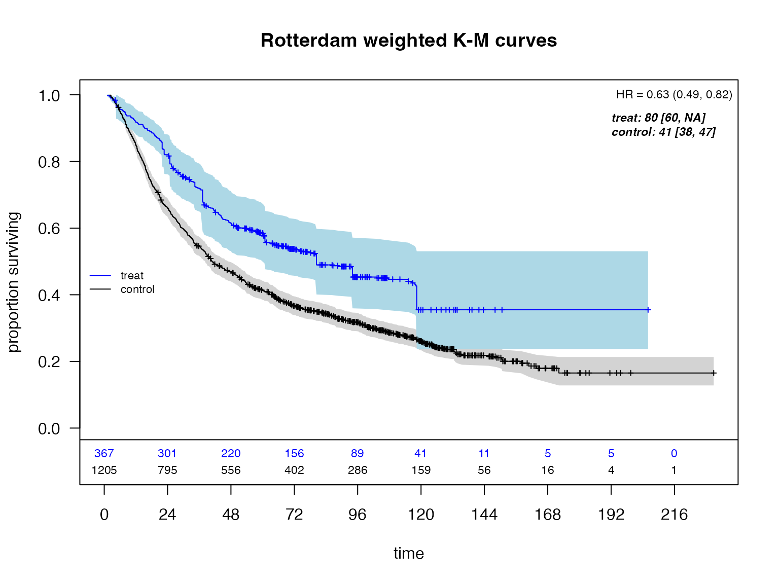 plot_weighted_km(dfcount=dfcount_rotterdam_wtd, conf.int = TRUE)