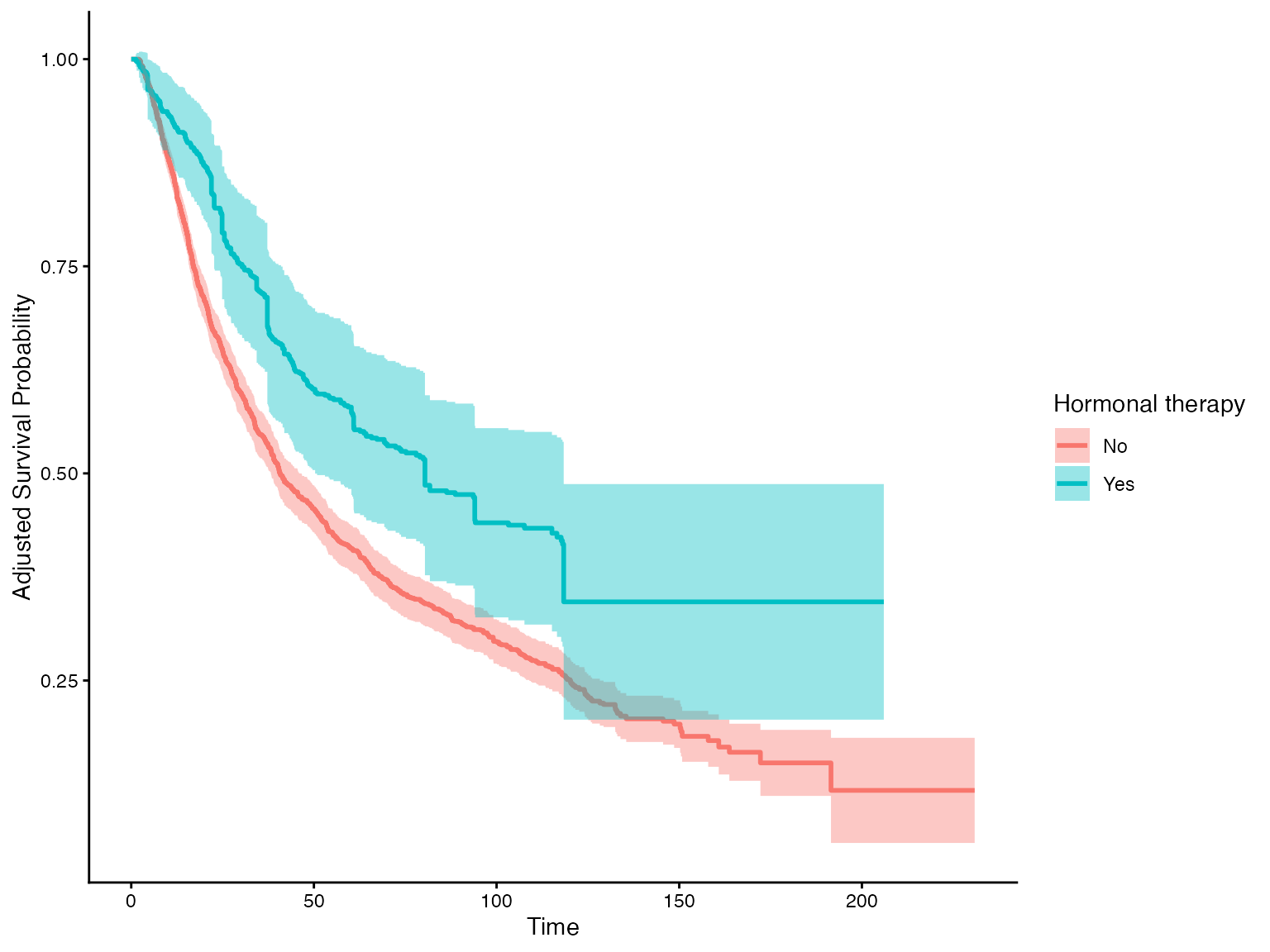 plot(iptw, conf_int = TRUE, legend.title = "Hormonal therapy")
