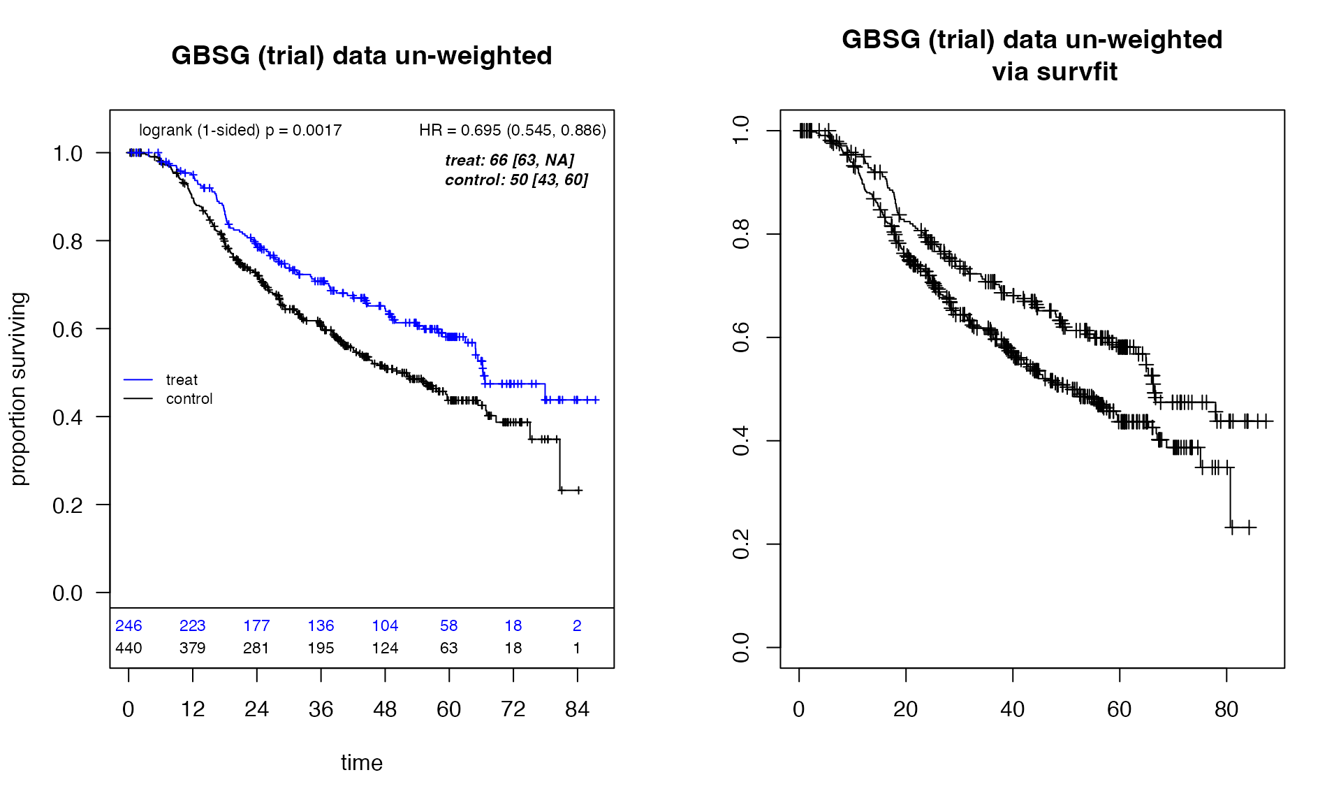 plot_weighted_km(dfcount=dfcount_gbsg, conf.int=FALSE, show.logrank = TRUE,