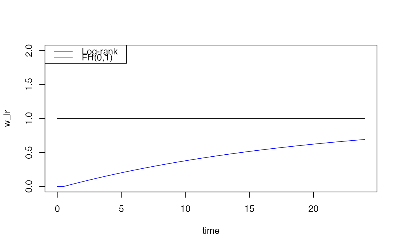 legend("topleft", c("Log-rank", "FH(0,1)"), col = 1:2, lty = 1)